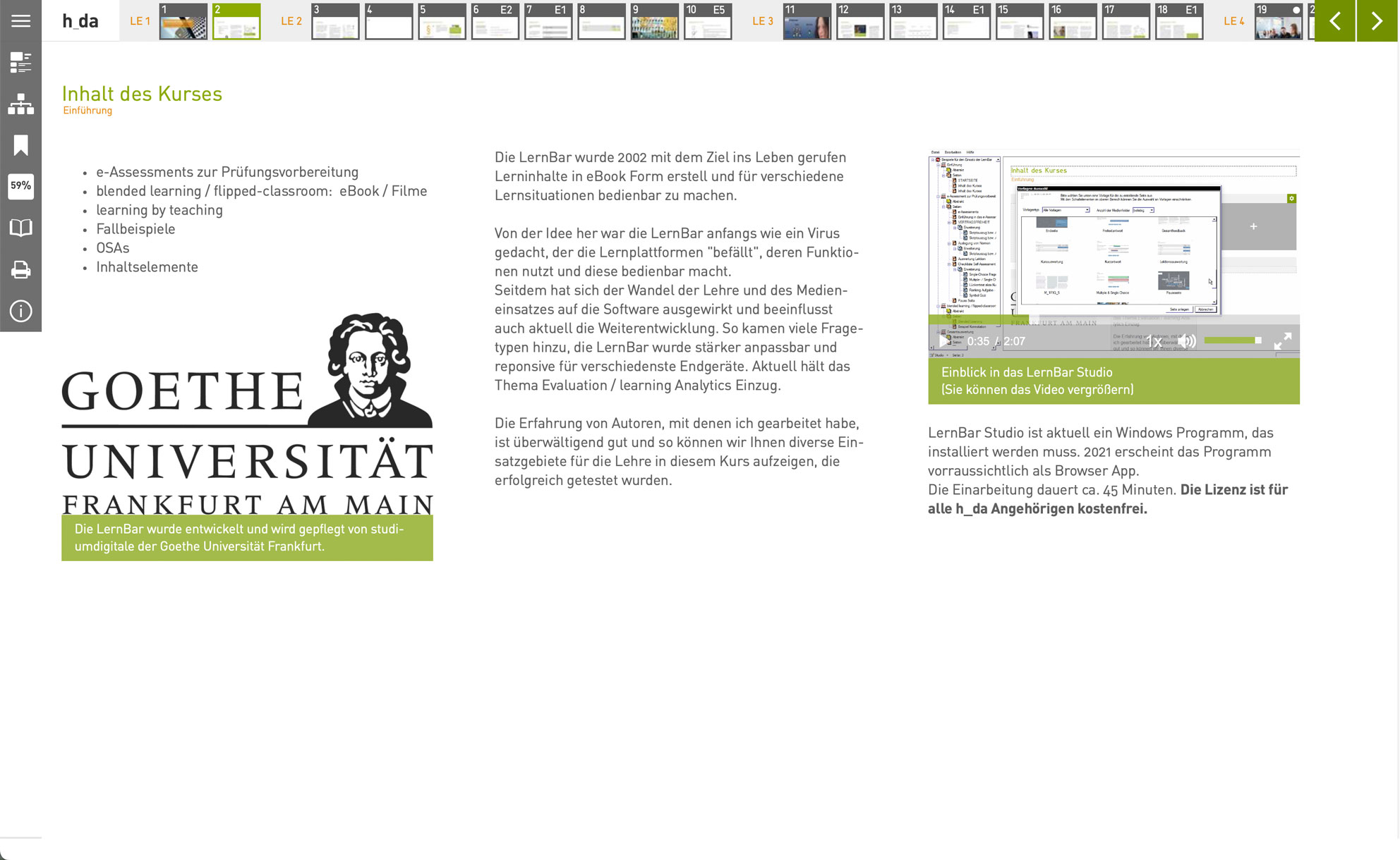 Die LernBar wird kontinuierlich von studiumdigitale an der Goethe Universität Frankfurt weiterentwickelt und bietet eine professionelle Anmutung auf allen Endgeräten. Dabei lässt sie sich über die Aktivität „Lernpaket“ direkt in Moodle, aber auch ILIAS, OLAT…Kurse einbetten und bietet dadurch auch einen besonderen Mehrwert für die EUt+ Lehre. Die Lerneinheiten (html5) laufen auch ohne Lern-Management-System und können direkt auf einen Webserver gestellt werden.