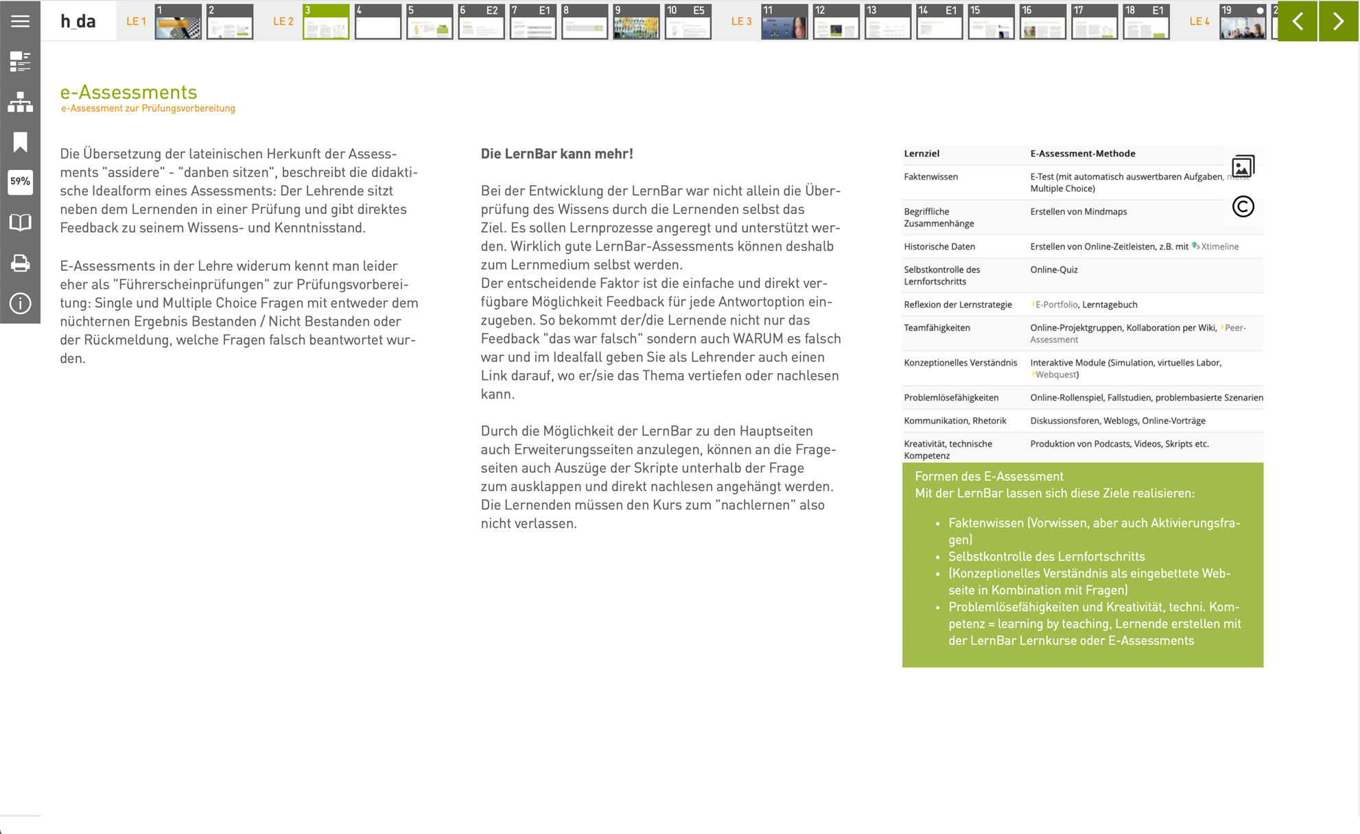 Die LernBar bietet die Integration von verschiedensten Medien und Fragetypen und eine Struktur, die beim Lernen klar zwischen prüfungsrelevanten Inhalten und zusätzlichem Wissen unterscheiden lässt. Die „What You See is What You Get“ Autorenumgebung begeistert Autor*innen seit Jahren.
