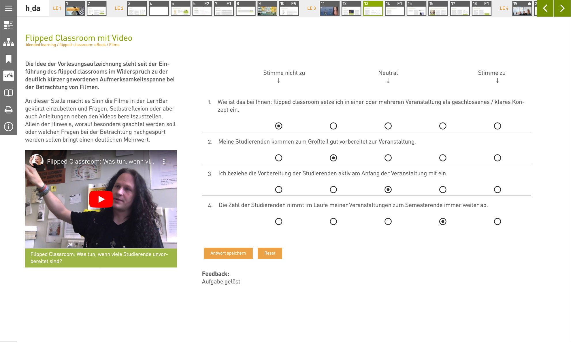 Der zentrale Gedanke der LernBar konzentriert sich allerdings auf die Studierenden. Die LernBar reduziert die Oberfläche auf das für das Lernen wesentliche und schafft Platz auf dem Bildschirm - sowohl auf Desktop-Rechnern als auch auf smarten Endgeräten. So liegt der Fokus ohne Ablenkung und zusätzliche kognitive Belastung auf dem Inhalt.